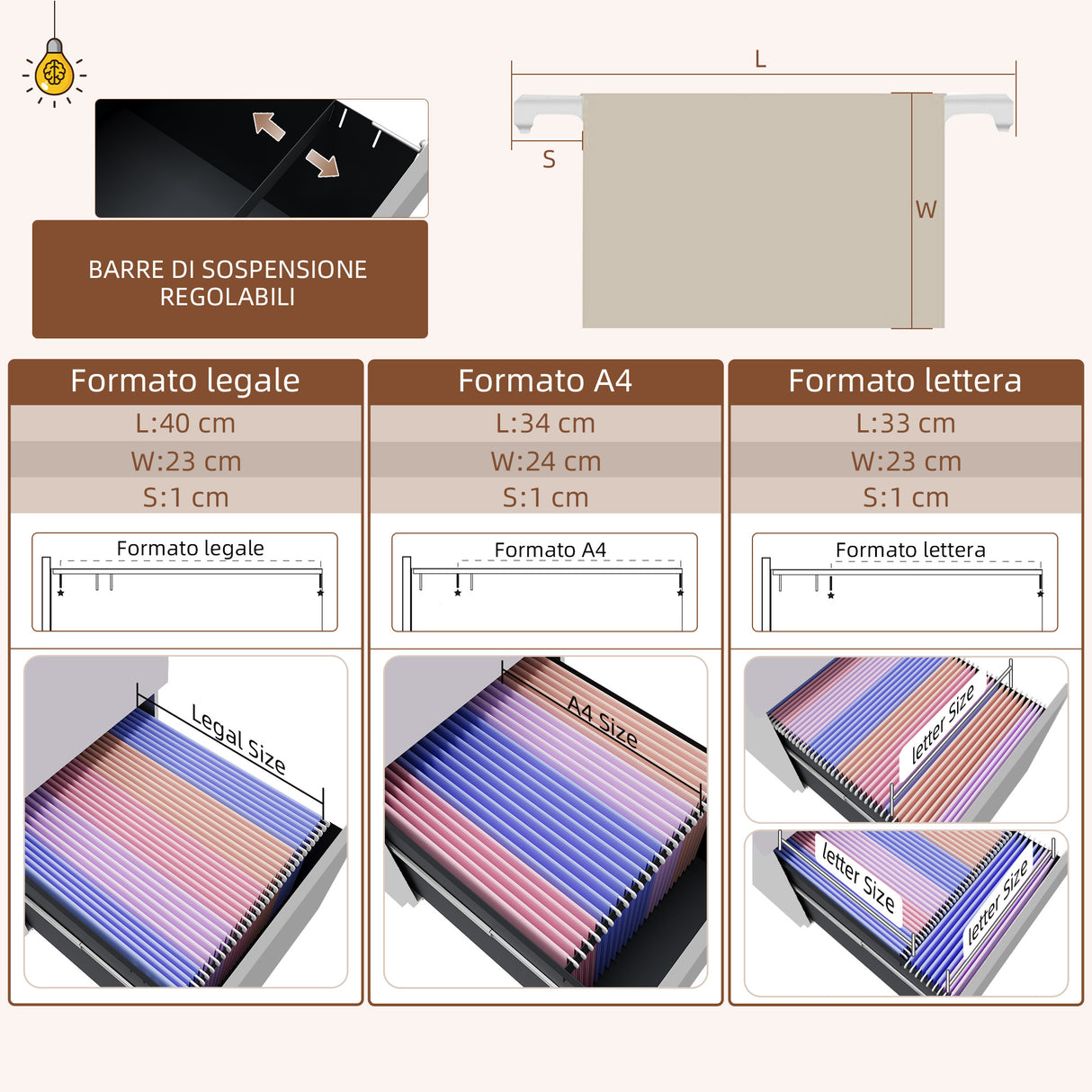 • Barra regolabile per contenere fascicoli in formato lettera, A4 e legale