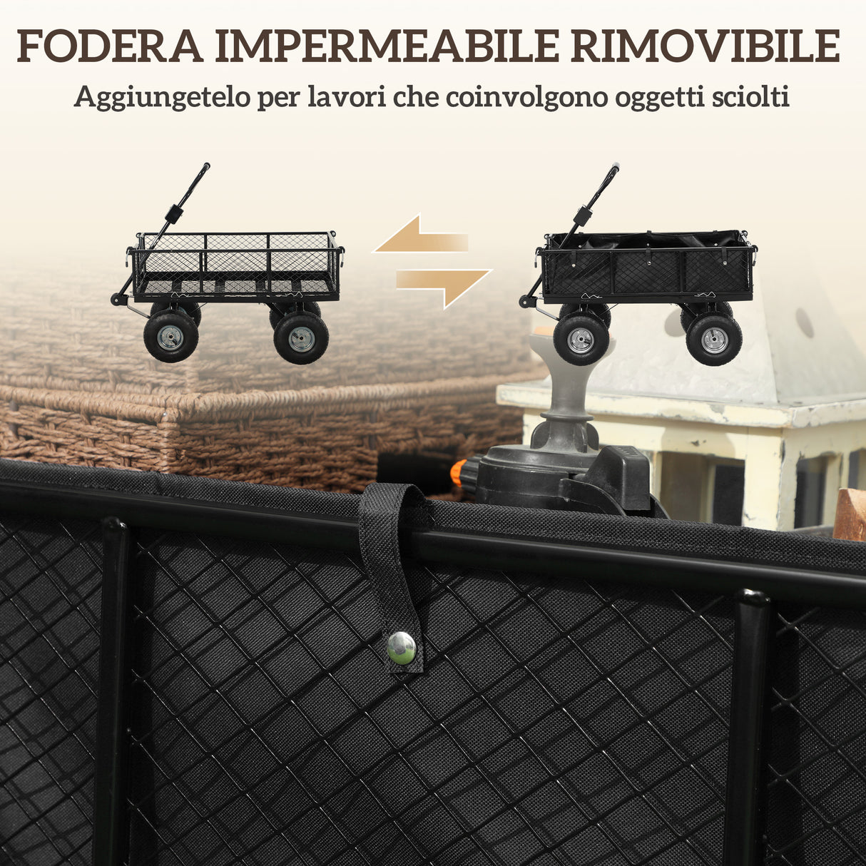 • Gli pneumatici in gomma da 25cm del carrello per giardino assicurano movimenti fluidi su vari terreni