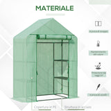 Questa serra da giardino ti permetterà di coltivare ciò che preferisci, proteggendo costantemente le piante dalle intemperie, dagli uccelli e dai parassiti. È dotata di un telaio in acciaio stabile, mentre la copertura in PE crea la giusta protezione per trattenere il calore necessario e proteggere la struttura dal vento e dalla pioggia. La porta avvolgibile della serra piccola ti consente infine di entrare e uscire per accedere all'interno in qualsiasi momento.Caratteristiche:• Solido telaio in acciaio con copertura in plastica resistente per proteggere l'interno da vento, pioggia leggera e freddo• Bordo allungato di 10 cm da interrare nel terreno per una maggiore stabilità• Due ripiani su ciascun lato per esporre e conservare le piante• Porta avvolgibile con cerniera per facilitare l'accesso e l'uscita• Quattro funi e quattro picchetti per il terreno inclusi• Montaggio richiestoDati tecnici:• Colore: Verde• Materiale: Acciaio, PE• Dimensioni complessive: 141L x 72P x 191A cm• Dimensioni della porta: 85L x 161A cm• Dimensioni ripiano: 60L x 26WP x 46A cm (per ripiano)• Capacità di peso: 10 kg (per ripiano)• Resistenza al vento: Livello 4 (velocità del vento inferiore a 28km/h)• Copertura in PE: 140 g/㎡• Contenuto della confezione:• 1 x Serra da giardino• 8 x Rete di plastica con fibbie• 1 x Manuale di istruzioni