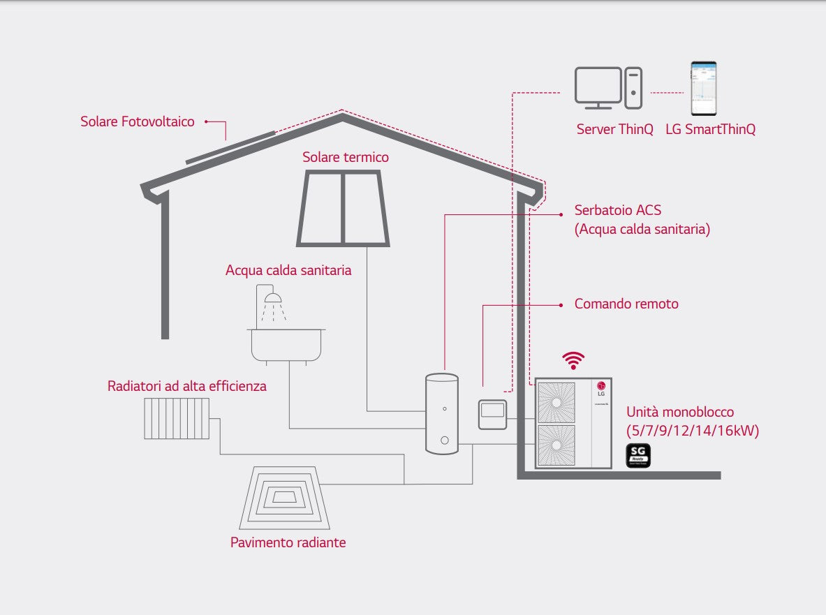 La soluzione di riscaldamento residenziale LG THERMA V può essere dedicata sia al riscaldamento e al raffrescamento degli ambienti sia alla produzione di acqua calda sanitaria. Rispetto ai tradizionali sistemi con caldaia risulta più efficiente e riduce le emissioni di CO2 utilizzando energia rinnovabile (contenuta nell'aria esterna.). In aggiunta è possibile gestire e monitorare da remoto l'intero sistema tramite l' app LG Smart ThinQ