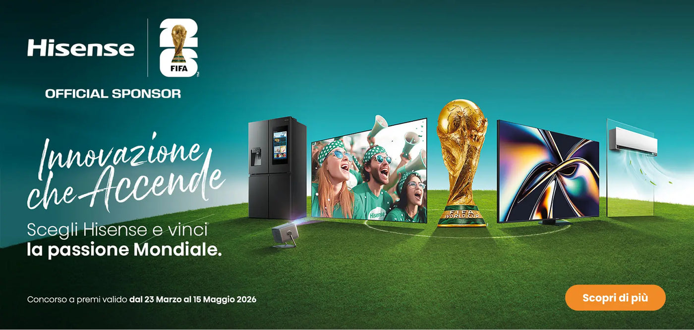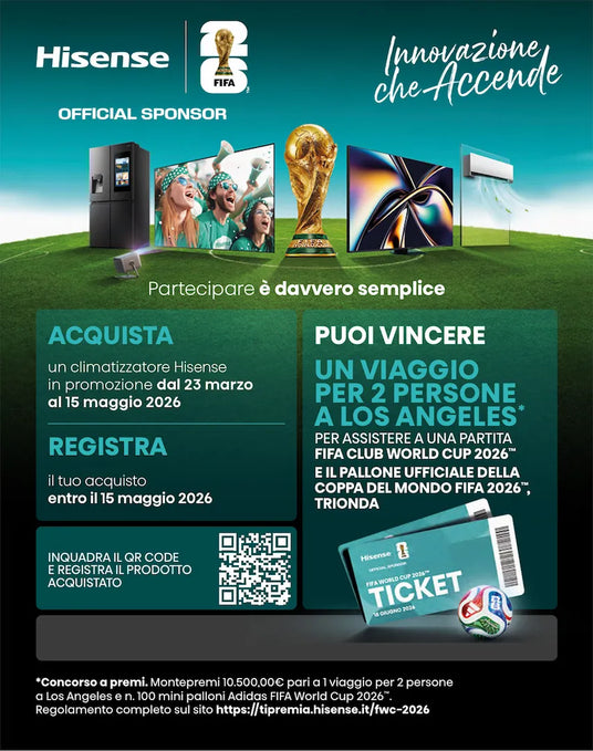 Vincere questi fantastici premi non è mai stato così semplice. Acquista un prodotto Hisense aderente all'iniziativa, registralo sul portale Hisense e prendi parte al sogno.