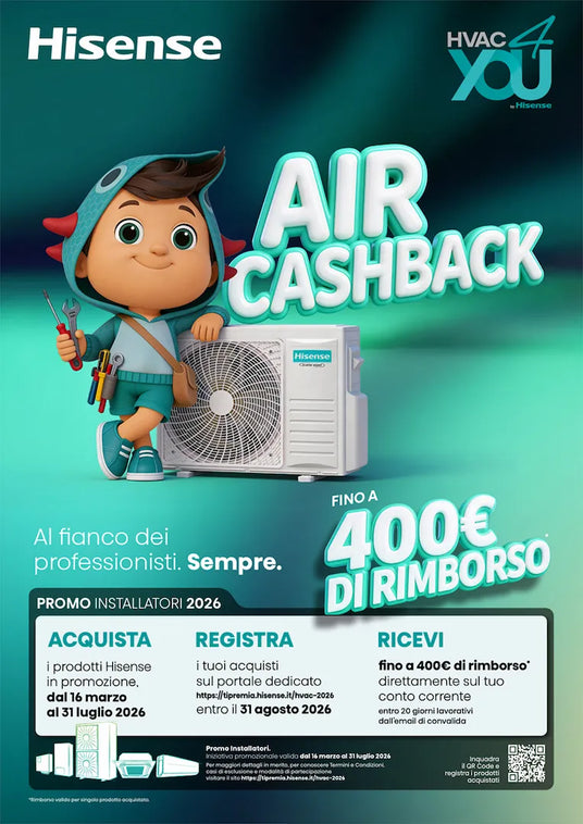 Con Hisense ogni installazione vale di più. Acquista i prodotti in promozione e ottieni un rimborso concreto, direttamente sul tuo conto corrente.