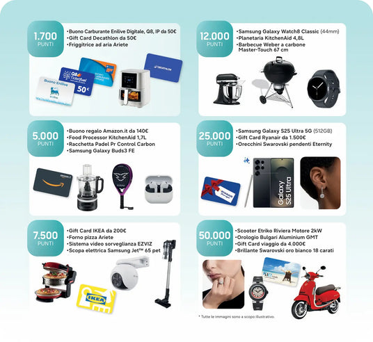 Accumula punti e accedi a un catalogo premi ricco di tecnologia, gift card, viaggi e prodotti premium.